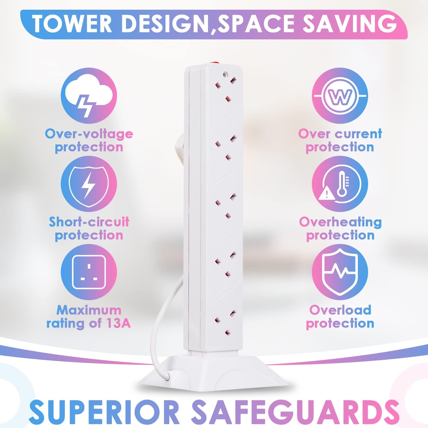 10 Gang Extension Lead Cable Tower Surge Protection 2m UK Mains Plug Socket