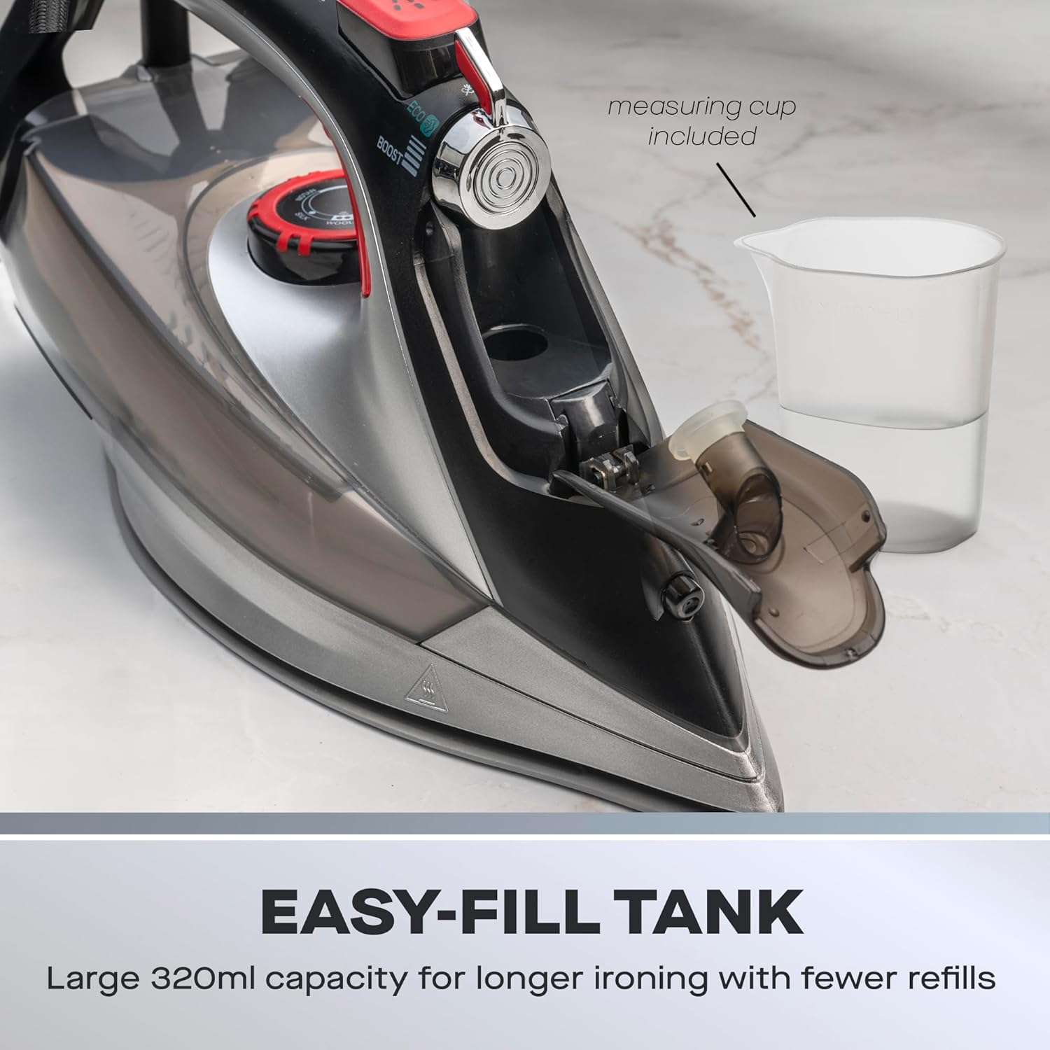 - CONVENIENT WATER MANAGEMENT – Simplify ironing with a spacious 320ML tank featuring a visible max line, anti-drip technology for mess-free usage, and an included measuring cup for precise water filling, making your ironing routine effortless and efficient