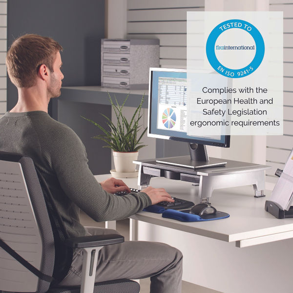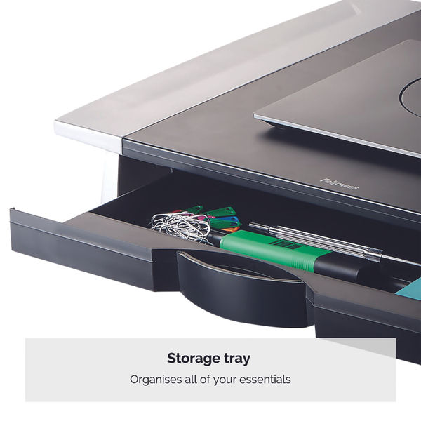 This Fellowes Office Suites Monitor Riser places your monitor at a comfortable viewing angle for ease of use and prevents aches and strains associated with computer use. Supports CRT or TFT monitors up to 36kg and features a storage drawer and space to stow laptop underneath for your convenience. This riser is height adjustable from 107 - 159mm, allowing you to customise your viewing angle to reduce neck strain. Work Better, Feel Better. Now with 20% Cashback* Simply order your Fellowes product today and go to www.fellowes-promotion.com to claim your cashback. *Offer valid from 1st January 2022 until 31st of March 2022, see website for full terms and conditions.