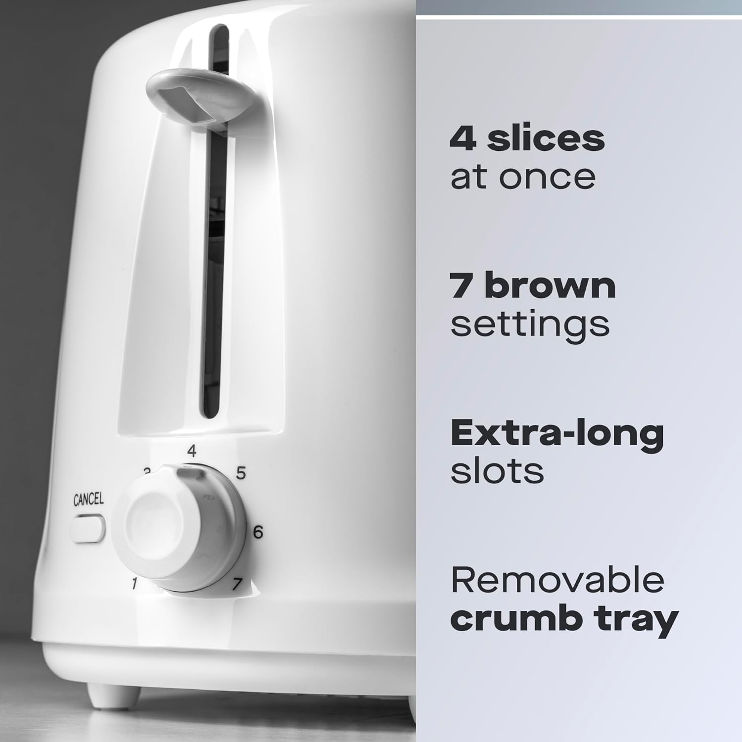 - CONVENIENT CANCEL FUNCTION – In total control with just one press! The handy cancel button lets you stop the toasting cycle at any moment, preventing over-toasting and ensuring your bread, bagels, or pastries come out exactly how you want them