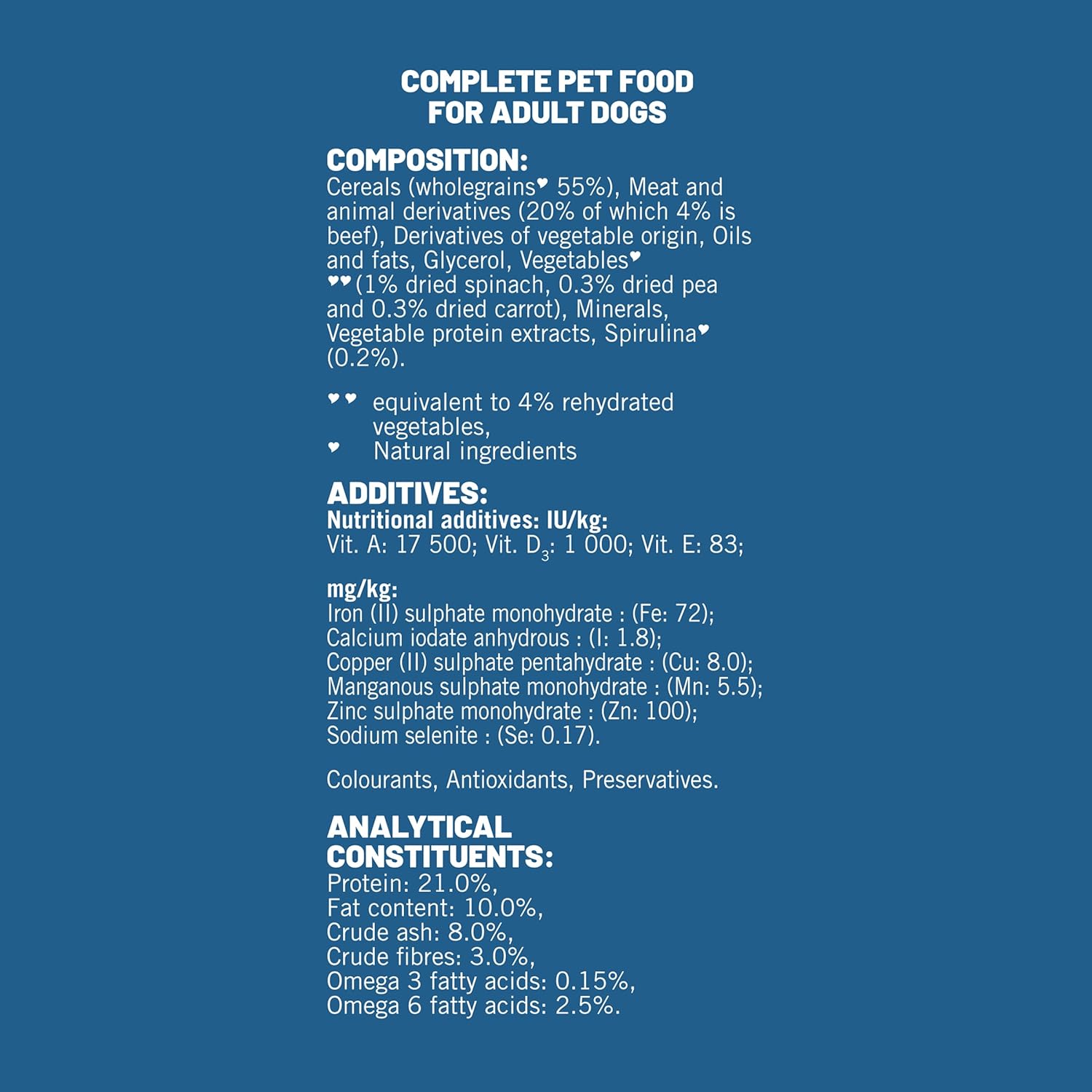 - Ingredients: Cereals (wholegrains 55%), Meat and animal derivatives (15%), Derivatives of vegetable origin, Oils and fats, Vegetable protein extracts, Glycerol, Vegetables (0,3% dried pea and 0,3% dried carrot), Minerals, Propylene glycol. including min. 4% wheat and 4% maize equivalent to 30% rehydrated meat and animal derivatives, with min. 14% beef equivalent to 4% rehydrated vegetables Analytical constituents: Protein: 21.0%, Fat content: 10.0%, Crude ash: 8.0%, Crude fibres: 3.0%.
