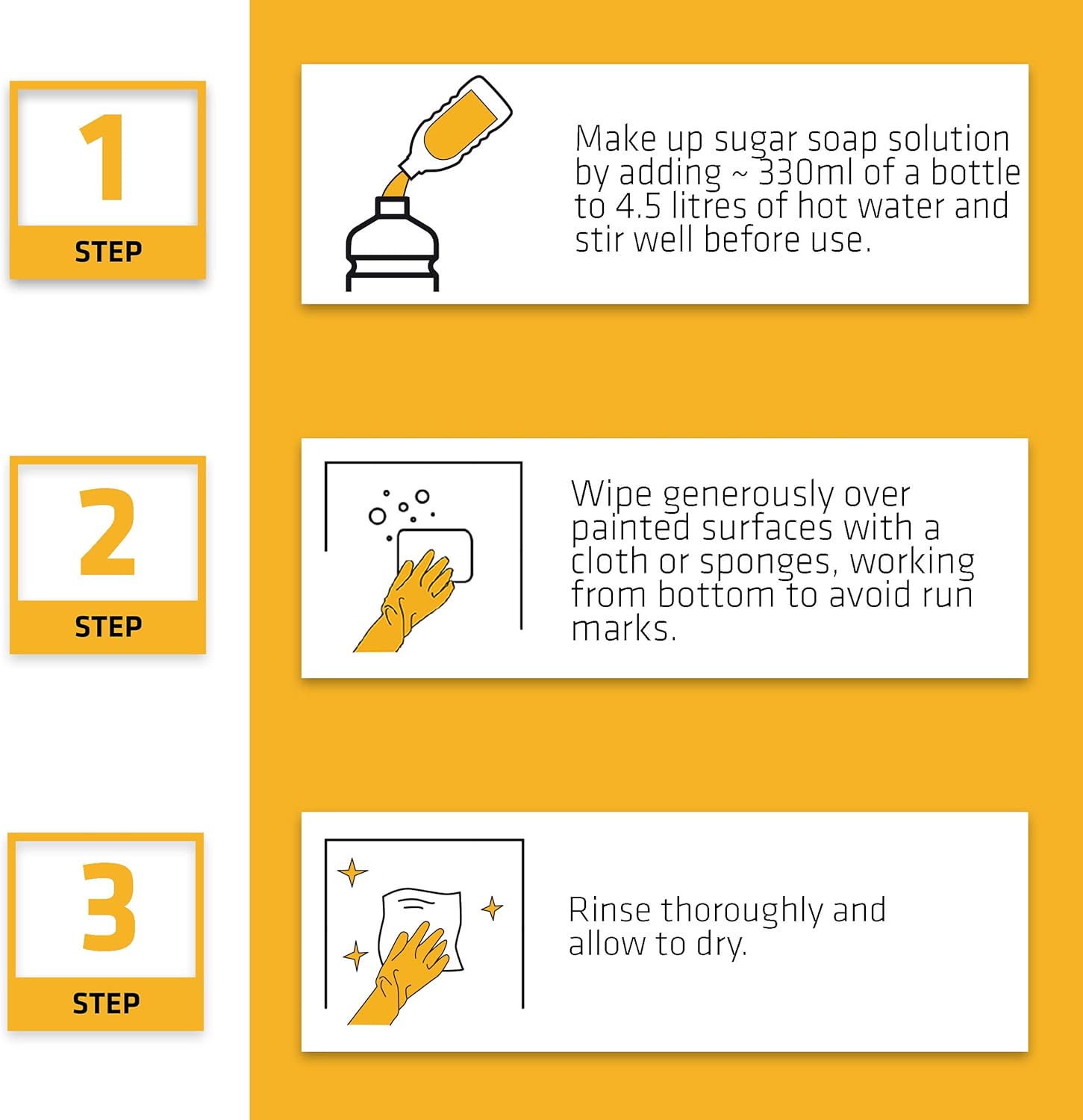 Ideal for preparing surfaces for repainting, cutting through grease and dirt, leaving the surface chemically clean so that a fresh coat of paint adheres readily. Excellent for general household cleaning. It is suitable for use on paintwork, vinyl wallcoverings and enamel surfaces.