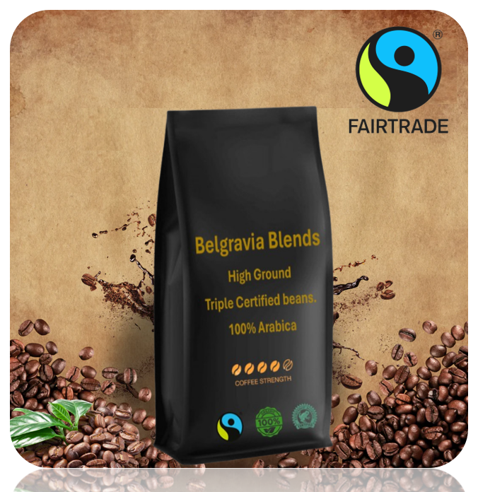 Our Belgravia High-Ground Blend is Triple Certified 100% Organic Arabica coffee carries Fairtrade, Rainforest Alliance and Soil Association accreditation, making it the most sustainable coffee you can buy. Triple certified Coffee beans ....what does that mean ? Well Not only are we Fairtrade & Rainforest Alliance Certified we are also Organic ! So every reason to take the moral High Ground.