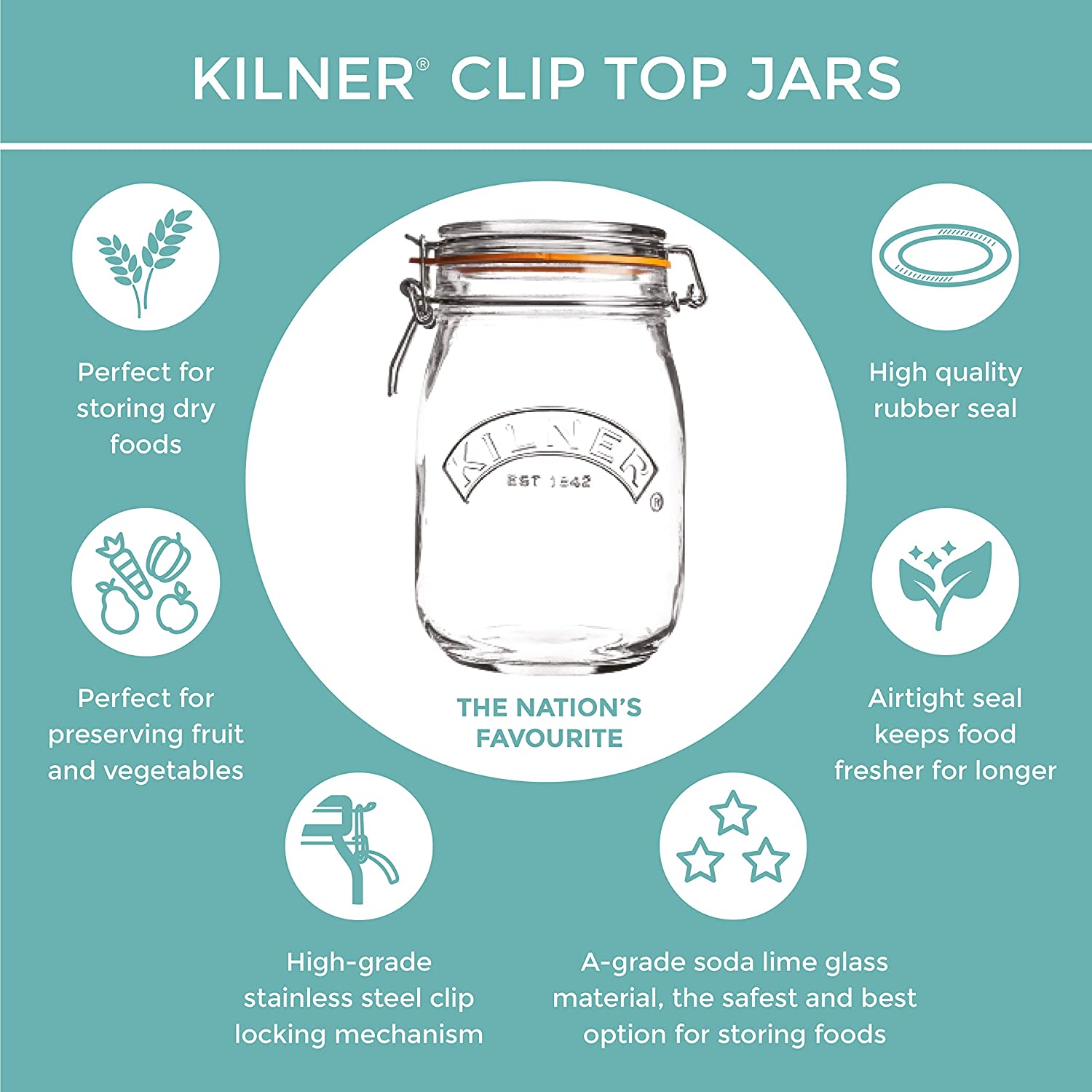 - STORE HOMEGROWN FOODS: The Kilner 2 litre clip top jar is perfect for preserving healthy, home grown foods, the contemporary square jar shape is space saving making it ideal for pantry storage, the jar capacity is 2 litre / 2000 ml which is the perfect size for pickling large vegetables, preserving whole fruits and storing dry foods like biscuits, cereals and pasta