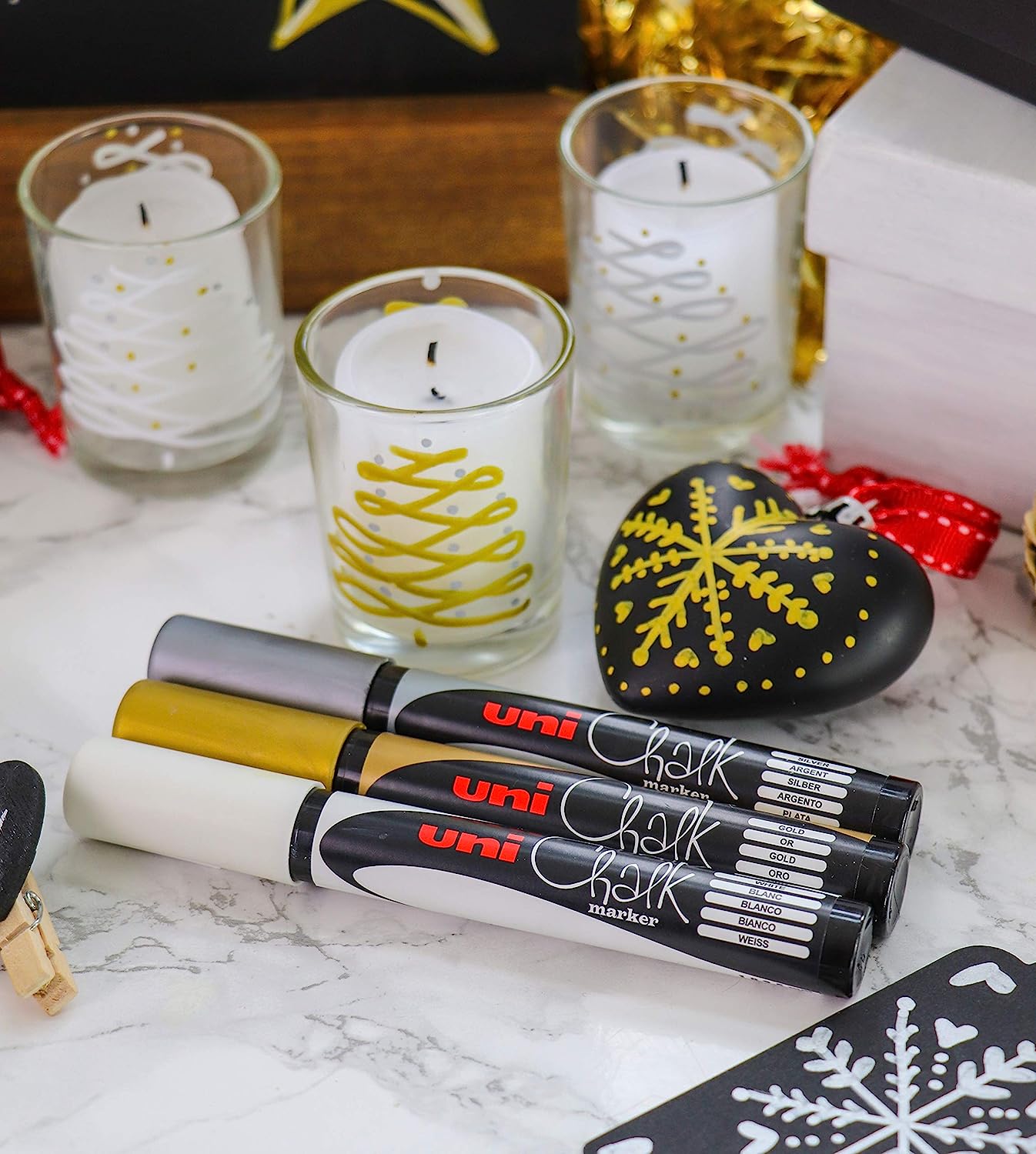 The UniChalk Marker is a non-permanent marker pen, which writes on and is easily removed from chalk boards, windows and other non-porous surfaces, including metal and plastic. With a 1.8-2.5mm line width, these markers use water-based paint to create vivid coloured writing with a medium bullet tip, ideal for creating eye-catching displays. For writing that is weather resistant, but which can be easily cleaned off with a damp cloth, choose a Uni Chalk Marker. This pack contains four white chalk markers.