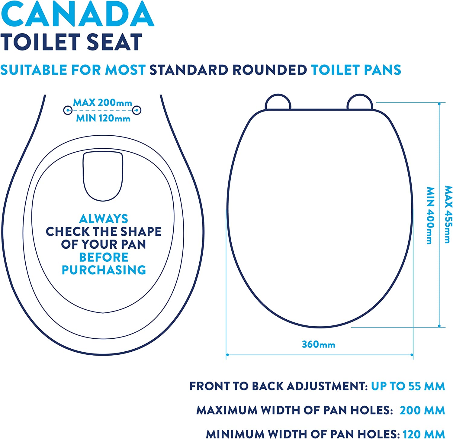 - Adjustable hinges fit all standard toilets