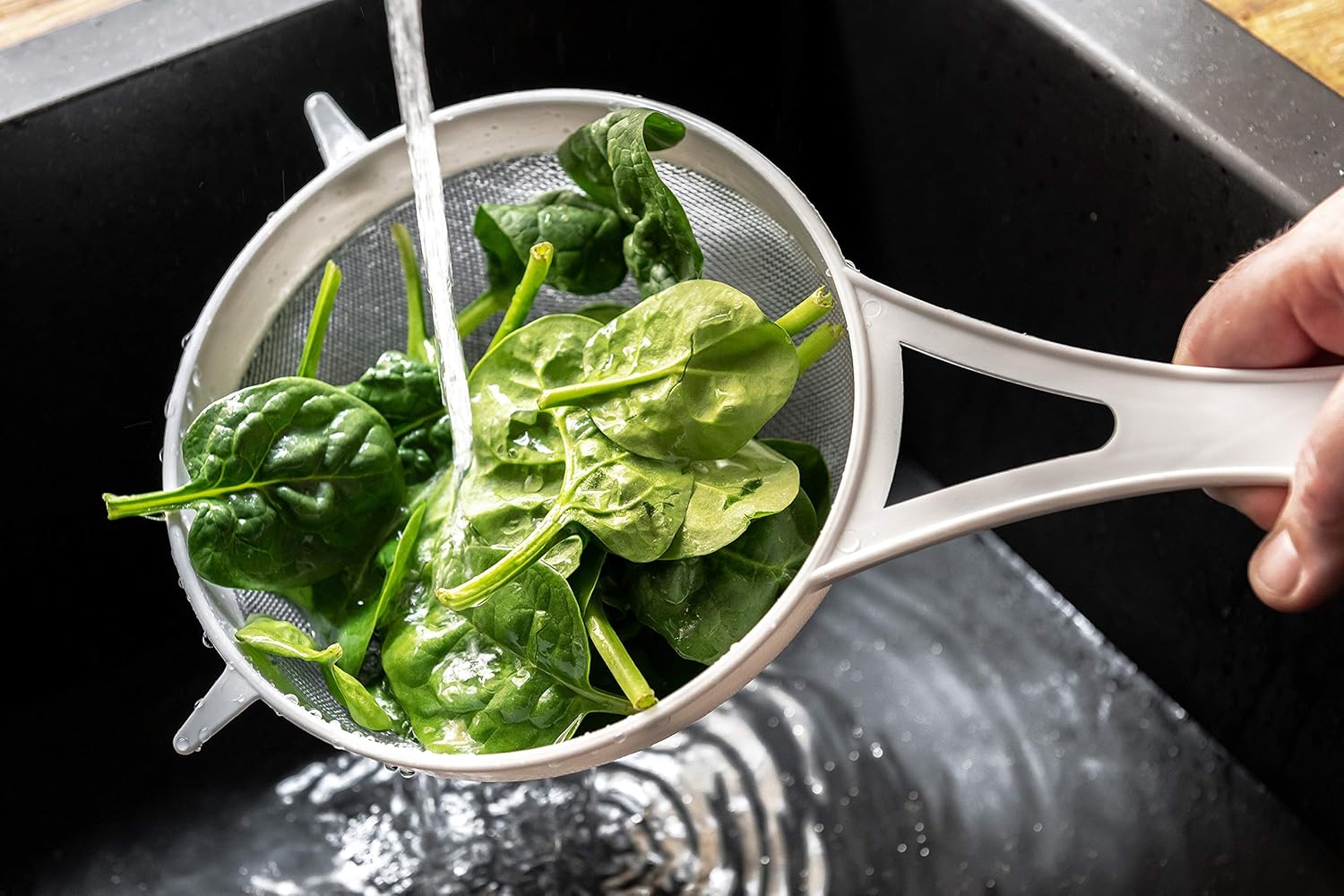 This plastic is durable and can withstand frequent use. Plastic is a great cost-effective alternative to stainless steel, and the white plastic would fit in with other kitchen utensils. Handwashing is recommended. The strainer also has a pre-drilled hole at the end of the handle, which is great for storage purposes where space might be limited. The strainer can either be hung up or stored with other utensils.