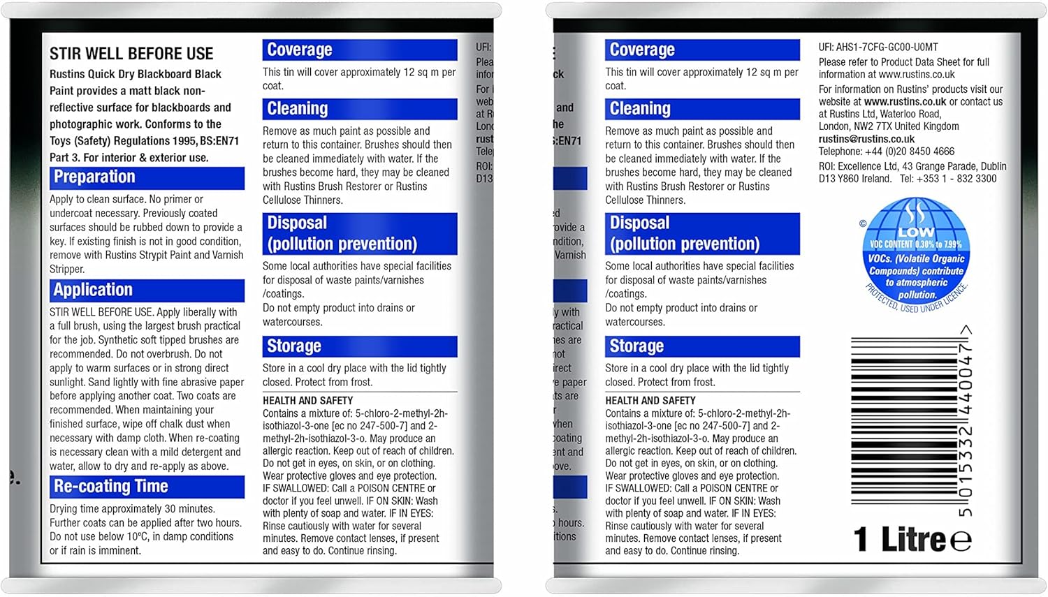 Turn almost any surface into a chalkboard with Rustins Blackboard Paint. Just one or two coats will give you a non-reflective, matt black surface that grips chalk for easy marking.