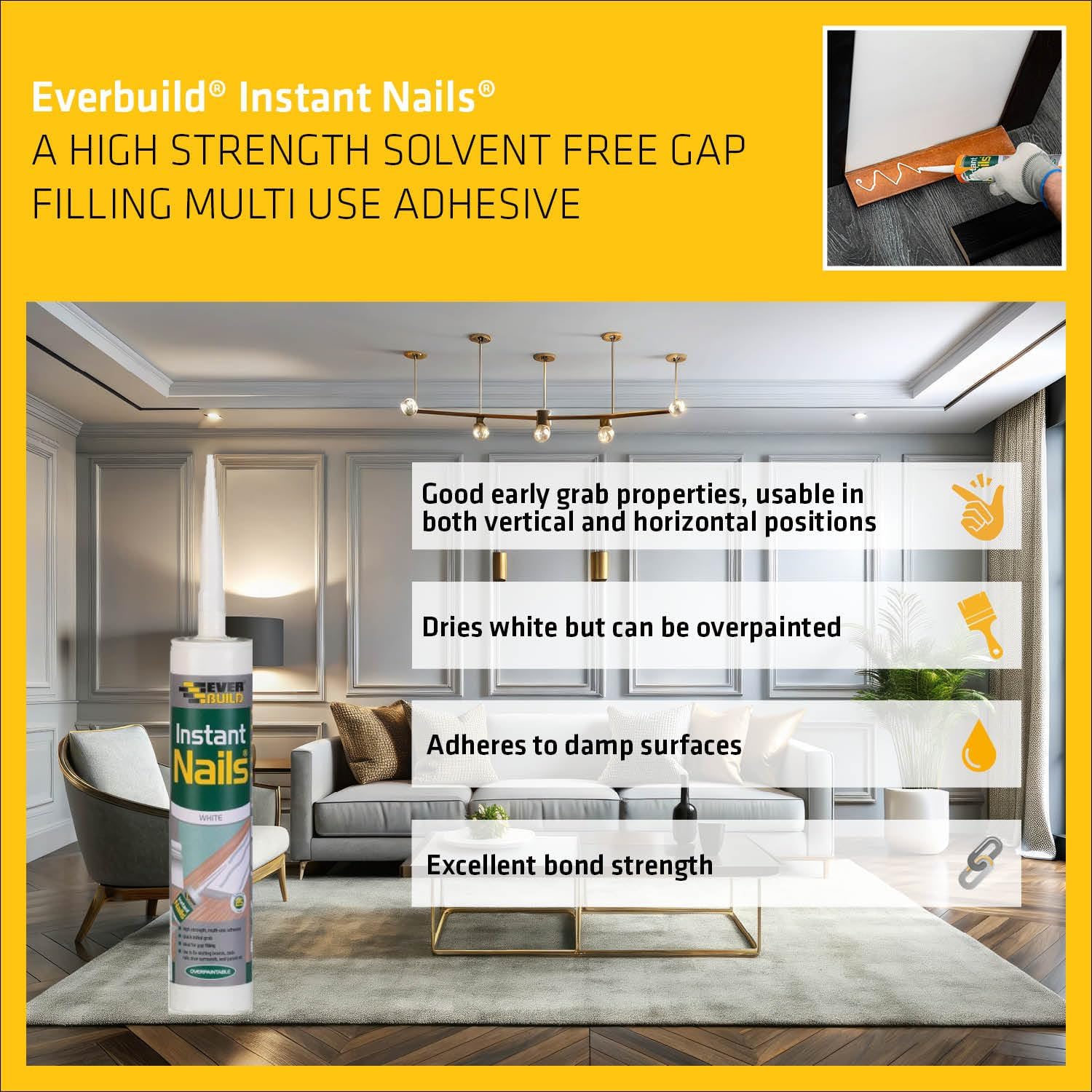 Everbuild Instant Nails can be used to achieve a number of tasks, including – Bonding dado rails, architrave’s and skirting, Fixing wall cladding direct to internal wall surfaces or timber battens, therefore being able to fix battens directly onto walls without fastenings. Similarly for bonding carpet gripper systems to most floors without the need for nails or tacks. Bonding stair nosing to concrete or wooden stairs. Securing aluminium or other skin panels to the framework or portable industrial buildings and caravans.