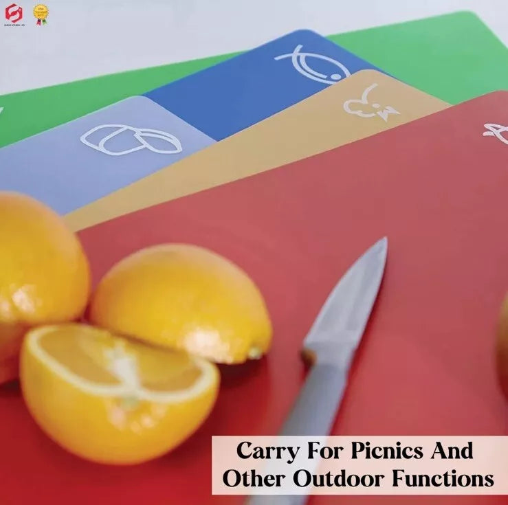 - Set of 4 handy flexible cutting mats, colour coded for food types: blue (fish), Red (meat), yellow (poultry), green (vegetables & salads), to help prevent cross contamination of foods whilst cooking