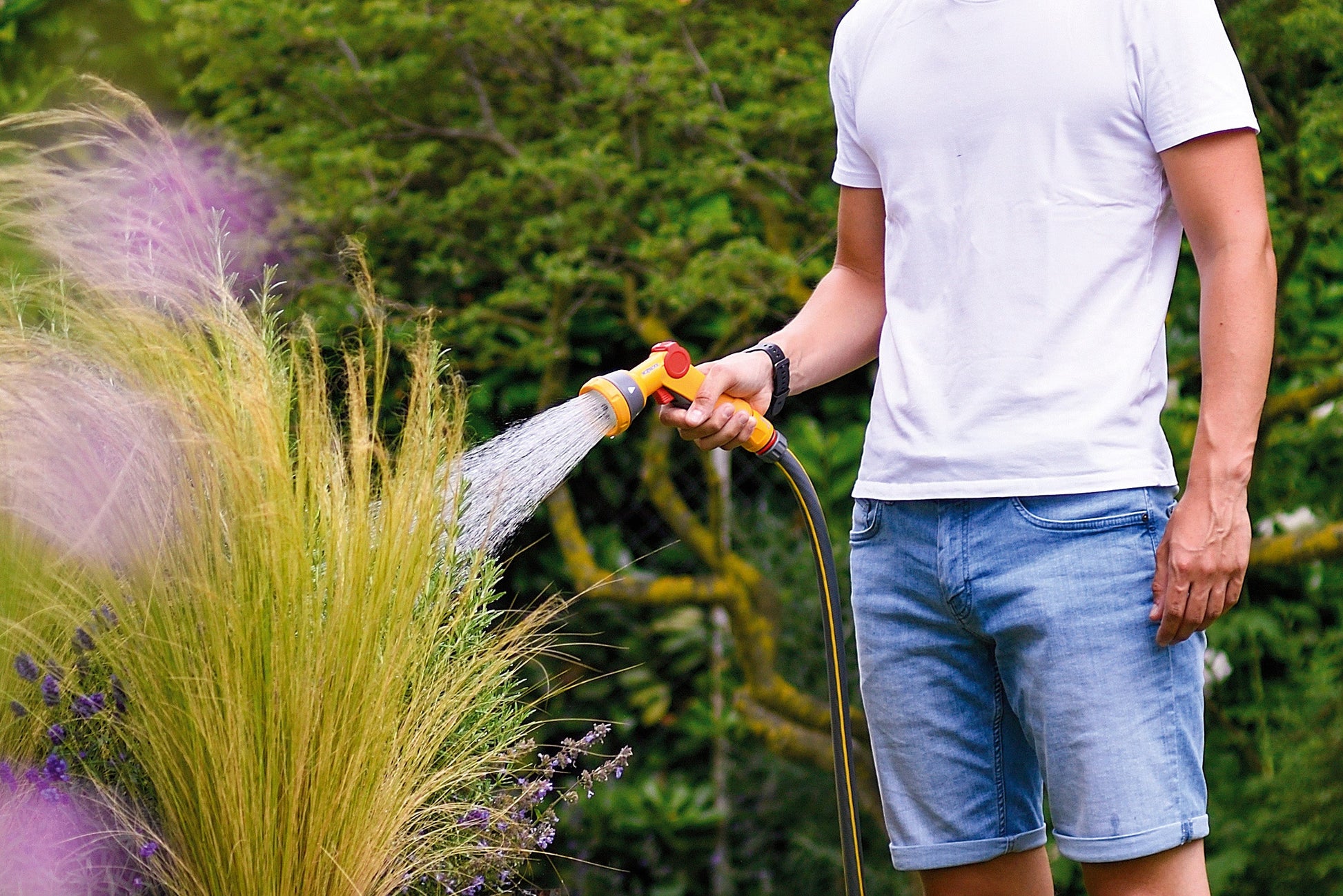 Compact water spray gun that is packed with features including five spray patterns, making it perfect for watering and cleaning.
