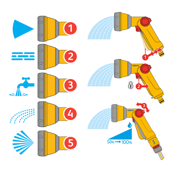 - Five spray patterns for garden watering and cleaning tasks
