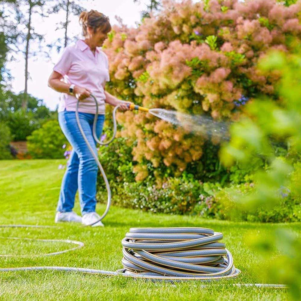Hardwearing and flexible multipurpose 30m braided hose for domestic watering tasks. Weatherproof, with UV and frost protection. Can be used with garden equipment such as spray guns and sprinklers.
