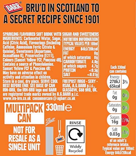 With a famed Scottish heritage, Irn Bru is a delicious, zesty carbonated soft drink, perfect for refeshment at wok, home or on the go. Sweet and refreshing, these handy 330ml cans are supplied in a generous pack of 24, which is great for bulk storage for work colleagues or the family.