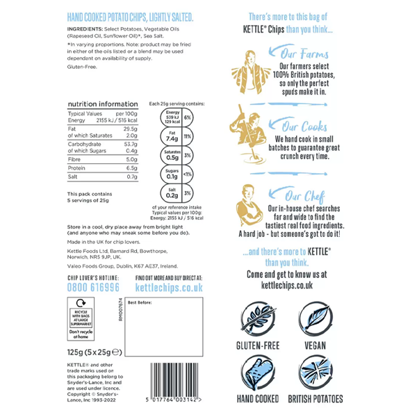 - Lightly Salted: The most popular flavour in the Kettle Chips range, seasoned with a sprinkling of natural sea salt.