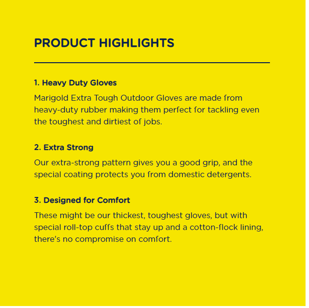 Marigold Extra Tough Outdoor Gloves are double-layered, giving extra protection for heavy-duty tasks in and outside the home. These tough, durable gloves protect your hands from harsh domestic chemicals and are recyclable with TerraCycle®.