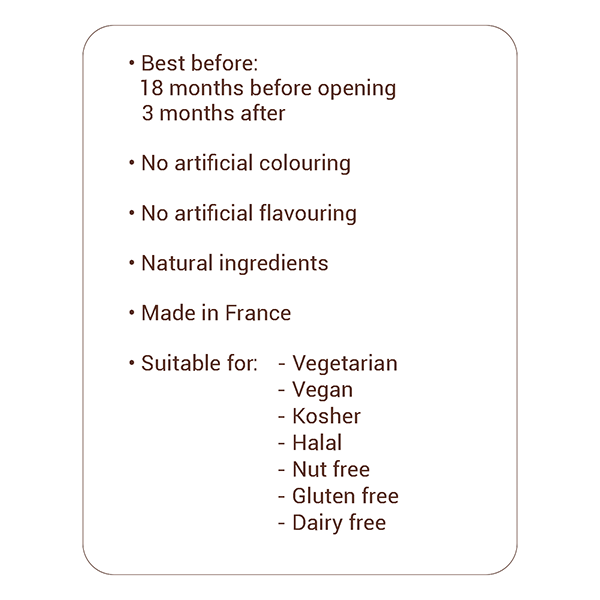 - Suitable for vegan, vegetarian diets. Nut-free, alcohol-free, Halal, Kosher. Natural flavourings.