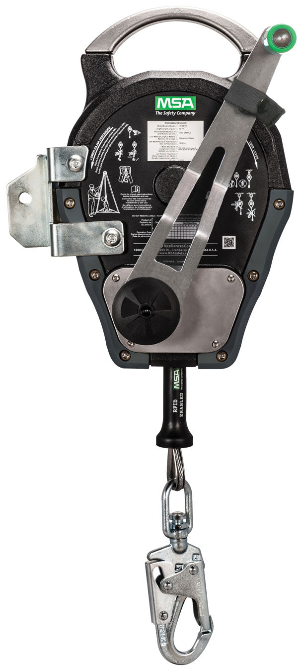 MSA’s Workman Rescuer provides fast, easy and intuitive fall protection with integral bi-directional retrieval capability. Not only does the Workman Rescuer arrest the fall, its retrieval capability allows the fallen worker to ascend or descend to a safe location. This durable, economical addition to the Workman Series of products offers fast installation and setup, ideal for applications where time and ease of use are a priority. The Workman Rescuer is also a stand-alone retractable device, as the carrying handle may be used as an anchorage attachment. Exclusive integral bracket uses existing tripod pin, leaving fewer components to attach, or become damaged or misplaced. Fall protection/retrieval mode knob simply pulls and rotates to activate. Use this device as a component of a confined space system for one application and as a standard self-retracting lanyard for another. Experienced and even novice users can learn setup and operation quickly Effectively comparable size and weight to competitive products Great for OGP turnarounds, construction, utilities and other confined space applications Galvanized or stainless steel 5 mm wire rope Integral mounting bracket Color-coded switch for retrieval mechanism activation Ergonomic, stainless steel carrying handle can also be used as anchorage connection point Built-in shock absorber Robust aluminium housing with thermoplastic bumpers Self-locking swivel snaphook with load indicator• Stowable, foldable crank handle RFID-enabled Maximum arresting force 6kN Certified to EN 360, EN 1496, Class B