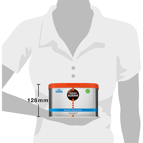 Nescafe Azera Americano decaffeinated coffee, a barista-style instant coffee with a rich and intense flavour for a quick and delicious cup of coffee any time of the day. A finely ground coffee made from a blend of Arabica and Robusta beans which are decaffeinated using water. This tin contains 420g of coffee powder.
