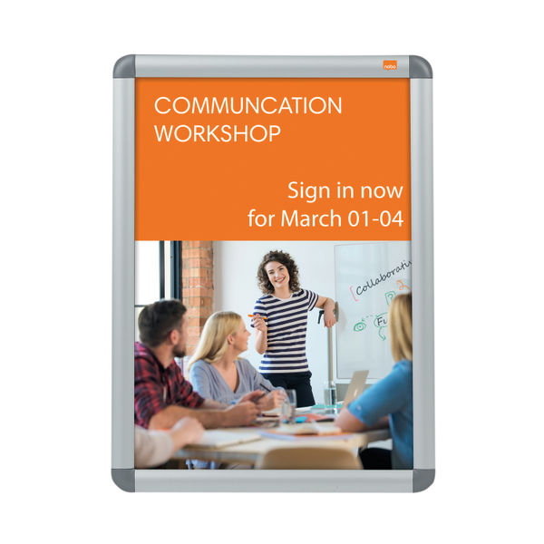 Wall mounted poster frame for the secure display of posters, signs and information. The smart aluminium snap frame trim gives a professional finish and allows quick and easy content change. This stable and secure sign holder has a back panel which attaches firmly to the wall using through corner mounting and the protective anti-glare cover is easy to wipe clean. An ideal solution for the display of temporary or permanent posters and signs. Display area A3.