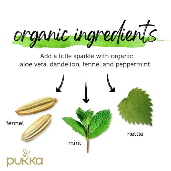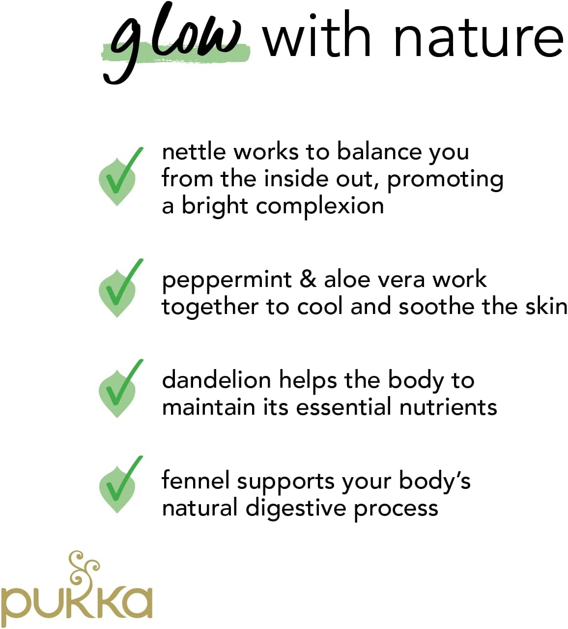 Glow from the inside out. It starts with a cup of herbal goodness, fresh with nature's green riches: FairWild nettle leaf, dandelion root and fennel seed, cooled with peppermint and aloe vera. It ends with a glow that flows into the sparkle of your eyes and the beauty of your skin. To Purity..
