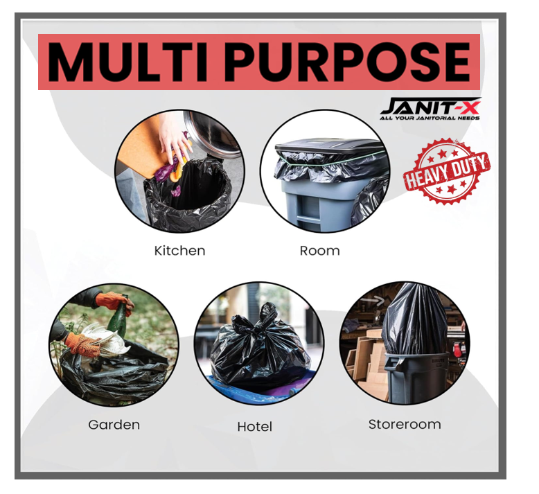 Heavy Duty black refuse sacks. Made from a minimum 98% recycled material.