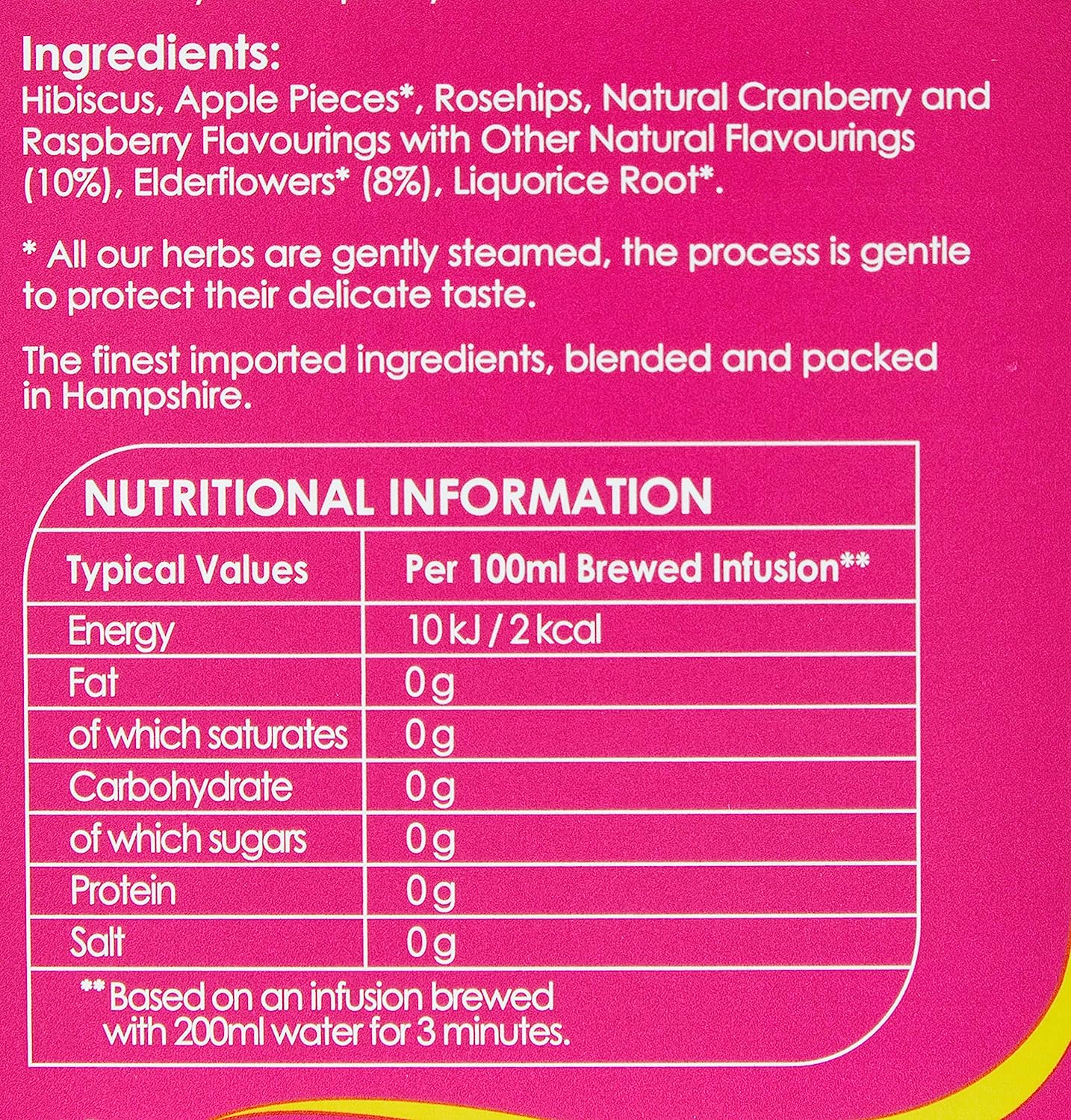 Enjoy the sweet tang of cranberries, raspberries and a hint of elderflower with these Twinings fruit infusion tea bags. It's bursting with a taste of summer that you can enjoy all year long. Made with all-natural ingredients, this tea is caffeine free and contains no added sugar. Drink it hot in the winter or chilled with ice for the perfect summer's day. This pack contains 20 individually wrapped tea bags.