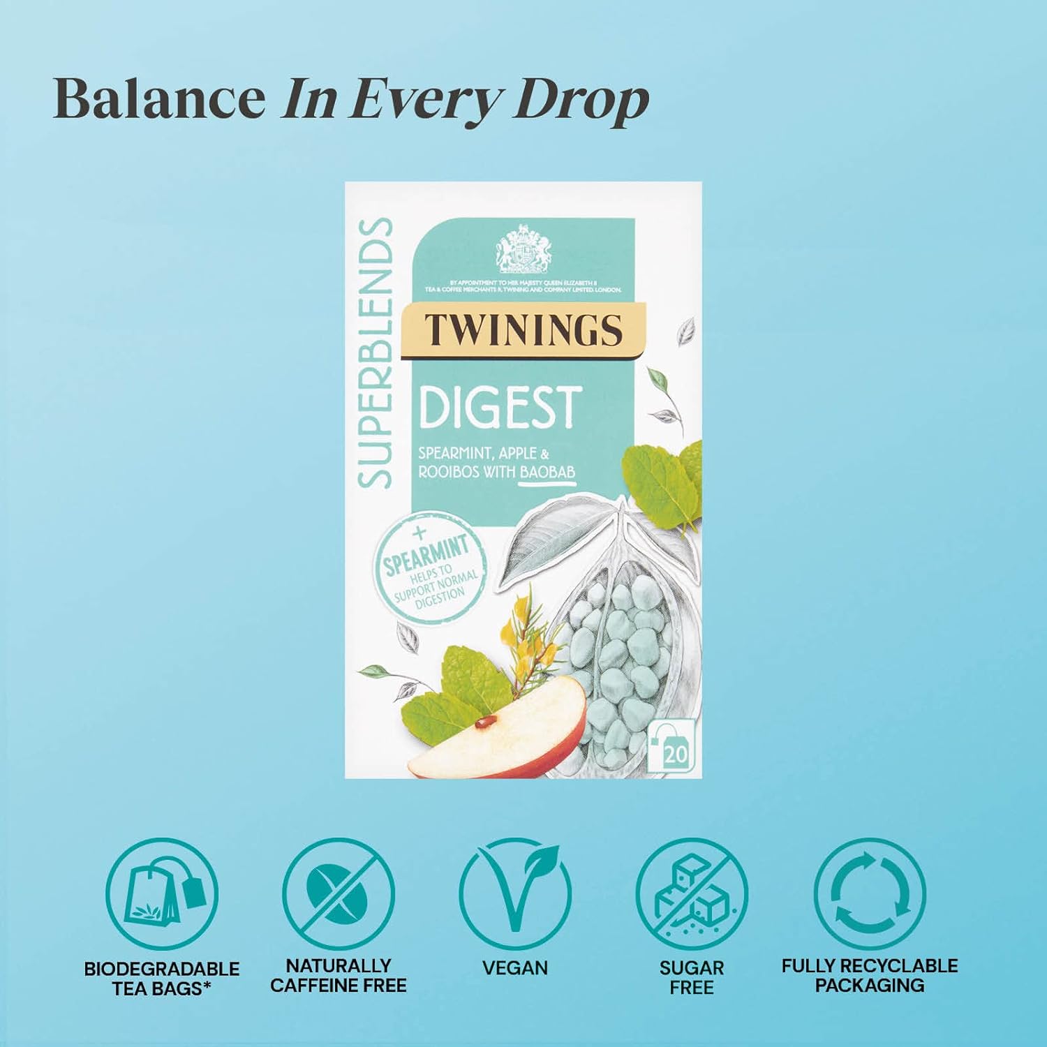 Twinings Superblends Digest Tea - Spearmint Herbal Tea Infusion with Apple, Rooibos & Baobab - 20 x Biodegradable Tea Bags