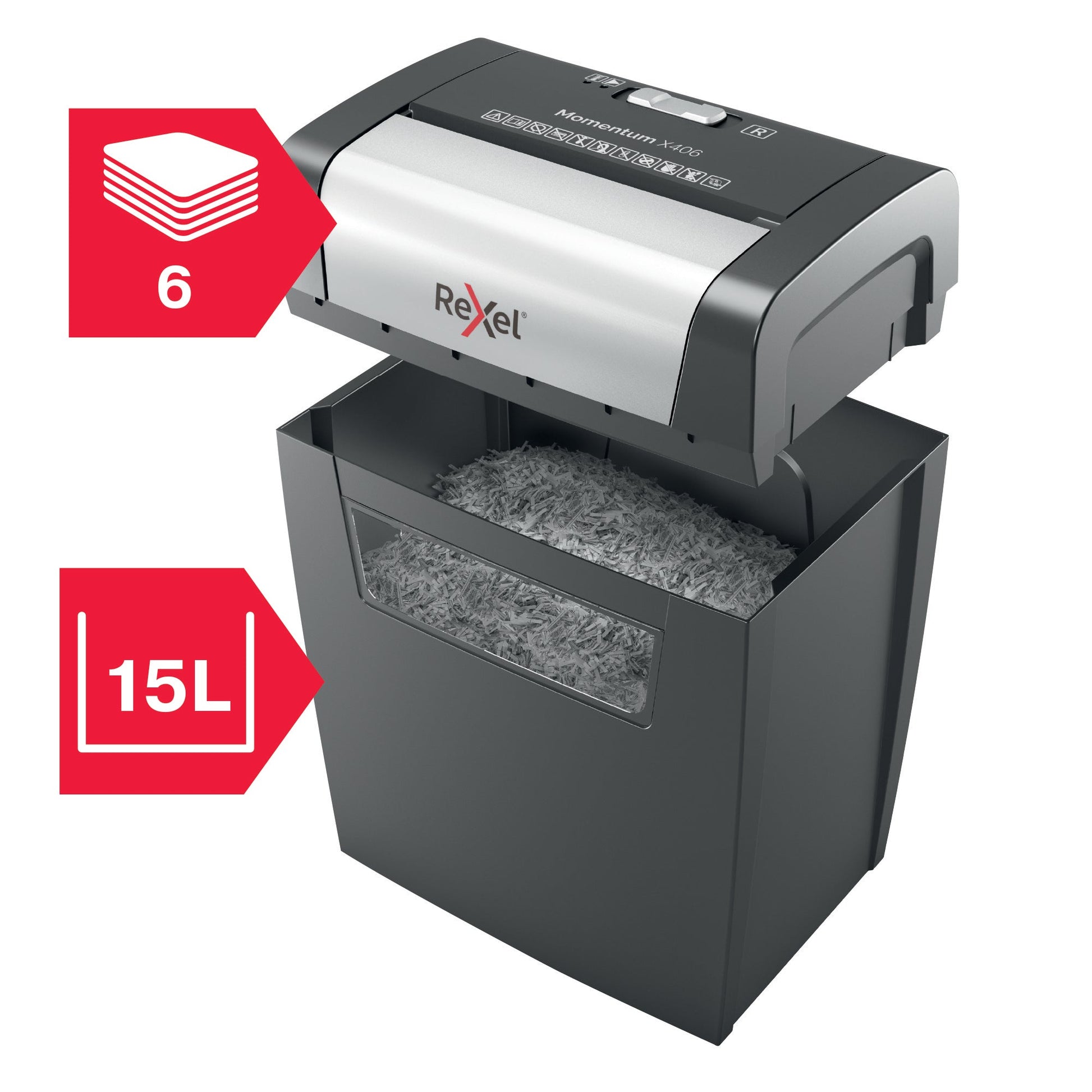 The Rexel Momentum X406 Paper Shredder shreds up to 6 sheets in one go, with a 3 minute continuous run time, making it ideal for home use. P4, Cross Cut 4x30mm pieces. 15L bin capacity (125 A4 sheets).
