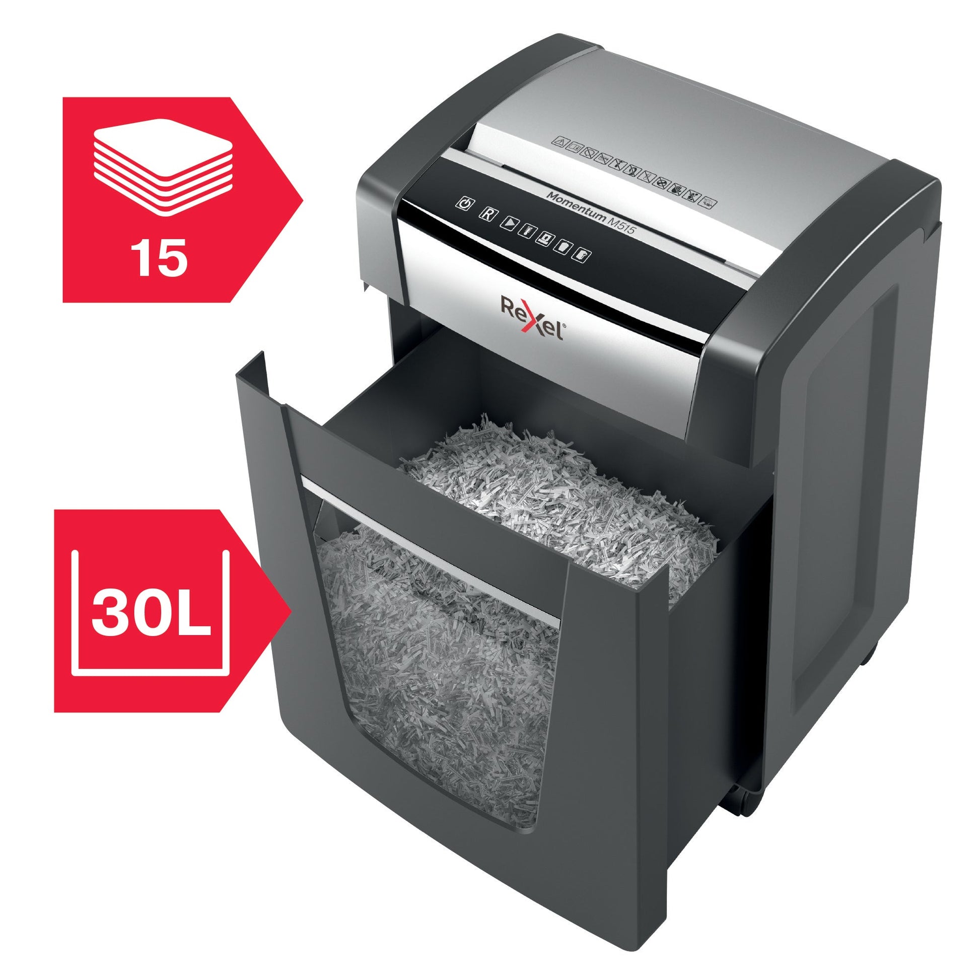 The Rexel Momentum M515 Paper Shredder shreds up to 15 sheets in one go, with a 4 hour continuous run time, making it ideal for a small office. The M515 comes with anti jam technology to guarantee uninterrupted shredding. P5 Micro Cut 2x15mm pieces for better security and more shredding before the bin becomes full. Quiet, with simple, intuitive, touch control buttons for easy operation and a generous 30L bin capacity (300 A4 sheets)