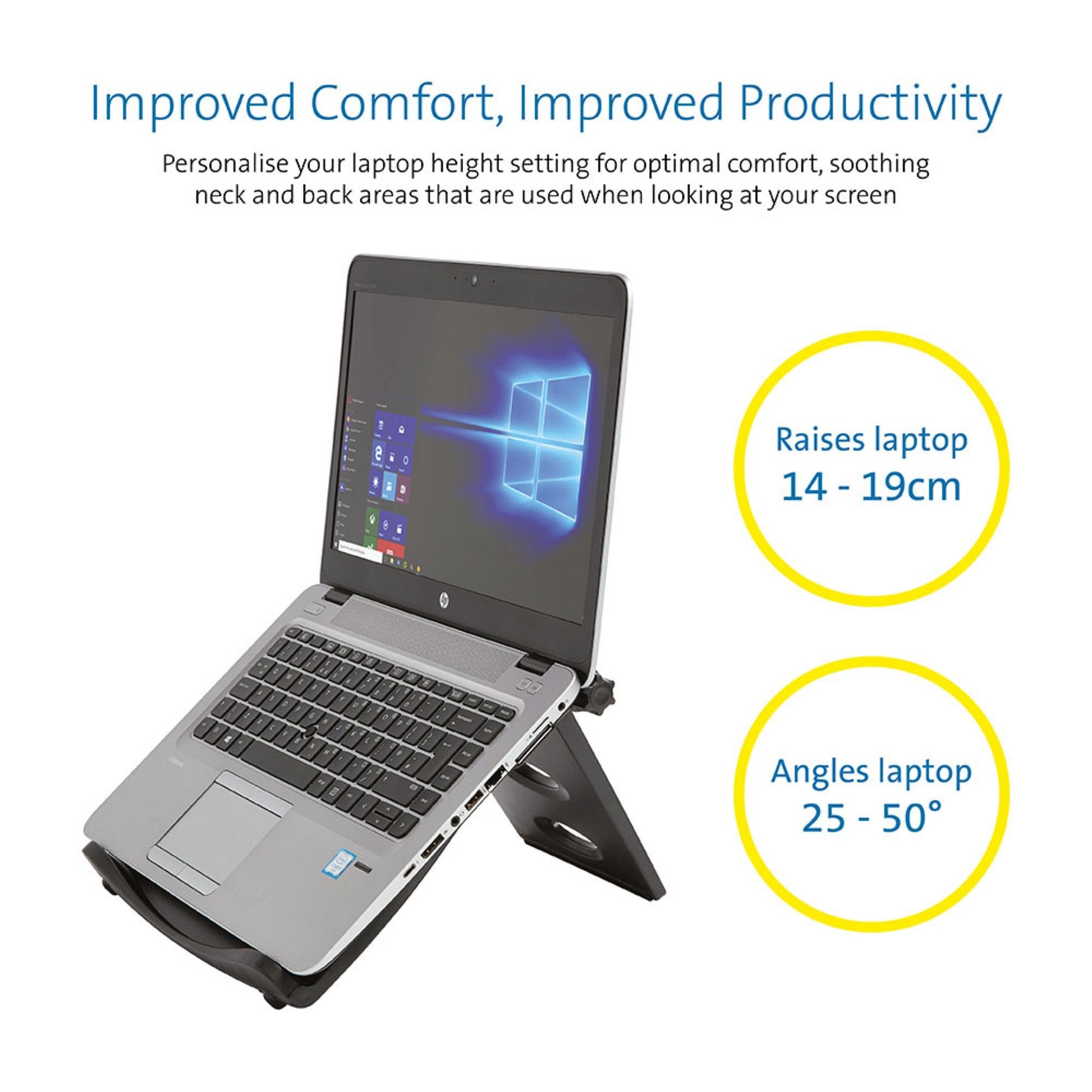 With over 20 years of ergonomics expertise, trust Kensington to maximize your desktop space with this professional laptop cooling stand. Our patented SmartFit System allows you to customize the height and angle of your laptop screen using the included hand chart to find your personal comfort colour, reducing back, neck, and eye strain. The Easy Riser lifts your laptop off your desk, promoting airflow to improve battery performance and ease the strain on internal components.