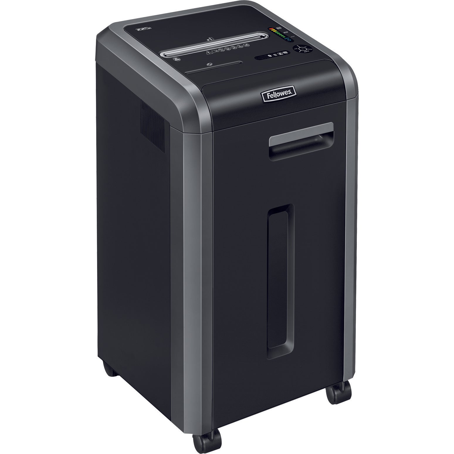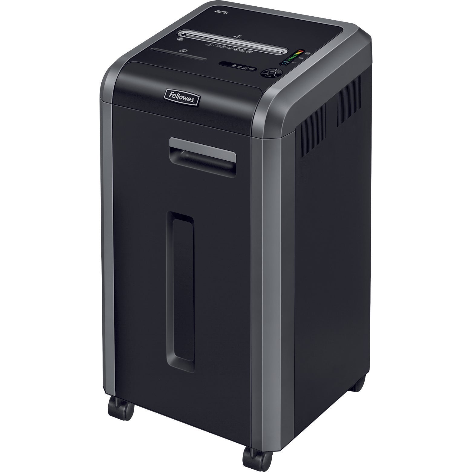 The Fellowes Powershred® 225i is a jam preventing, commercial, strip-cut shredder specifically designed for multiple users and shared workspaces such printing/ copy areas and open plan offices.Fellowes small office shredders are manufactured for premium durability. They feature long run times to withstand heavy daily usage and innovative features to enhance the shredding process. The Fellowes 225i is suitable for 5+ users and is a security (DIN) level P-2 shredder. It can shred up to 22-24 sheets per pass into 5.8mm strip-cut particles.As a strip-cut machine, it offers basic document security.The 100% Jam Proof feature brings you the latest in jam prevention technology; eliminating paper jams and powering through the toughest of jobs. The green to red colour gauge on the machine gives instant feedback whether or not you are within the recommended sheet capacity range for frustration-free, more efficient shredding. It also comes with SafeSense® Technology for added safety; automatically disabling the shredder when hands come into contact with the opening and stopping the shredding process immediately and for quieter shredder performance, the Silentshred feature minimises noise disruption in shared workspaces. Energy Savings System reduces in use energy consumption and powers down after periods of inactivity. With a continuous duty cycle for non stop shredding, it is ideal for high volume office use and the large 60 litre pull out bin means easier waste disposal and reduces the need for frequent emptying. It can also shred unwanted credit cards, CDs, staples and paperclips. Comes with a worry free 3 year full warranty for the machine and limited lifetime warranty for the cutter.