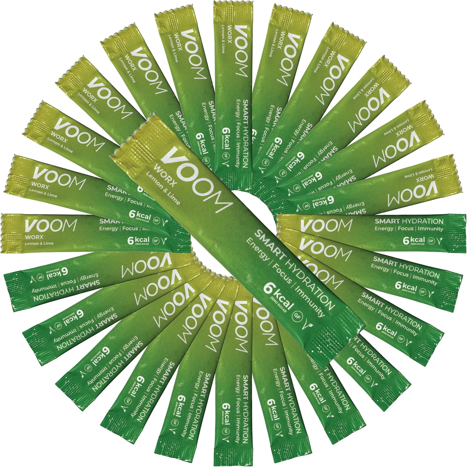 Smart Hydration - for the workplace: A premium performance drink powder when mixed and diluted with water provides rapid hydration. Includes a unique formula of electrolytes to replace essential salts lost in perspiration. A Cognition mix to help boost memory, attention and alertness. B Vitamins to aid your body’s normal energy-yielding metabolism and help reduce tiredness and fatigue. It uses natural colourings and flavour, has zero sugar and low calories. Consumption per day can be unlimited.Provides: Mental & Physical boost Rapid hydration Lemon & Lime Flavour 1 sachet per 100ml water servings Ingredients: Maltodextrin, Tapioca Starch, VOOM Electrolyte Formula (Pink Himalayan Salt, Potassium Chloride, Calcium Lactate, Magnesium Oxide), VOOM Cognition Formula (Alpha GPC, Cognizin Citicoline, L-Tyrosine), Lemon Juice Concentrate, Citric Acid, Sucralose, Ascorbic Acid (Vitamin C), Lime Juice Concentrate, Zinc Citrate, Niacin (Vitamin B3), Riboflavin (Vitamin B2), Vitamin D. A Nut-free ingredient supply chain cannot be guaranteed. Gluten free, vegan, vegetarian, Made in Great Britain
