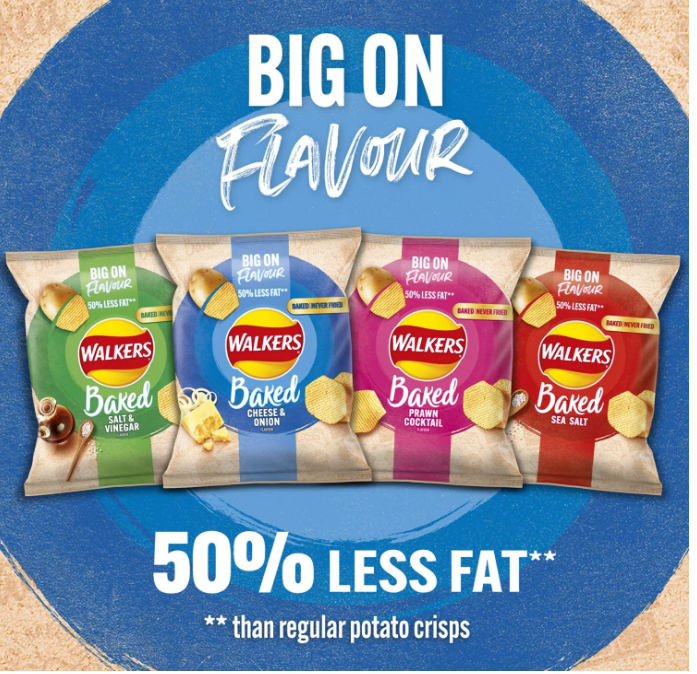 Discover Walkers Baked, the tasty oven baked crisp bursting with Cheese and Onion flavour Walkers Baked are baked twice for extra crispy crunchiness Enjoy as the ideal snack between meals or as a delicious way to complement your lunch Walkers Baked contain 50 percent less fat than regular potato crisps These tasty snacks are suitable for vegetarians.