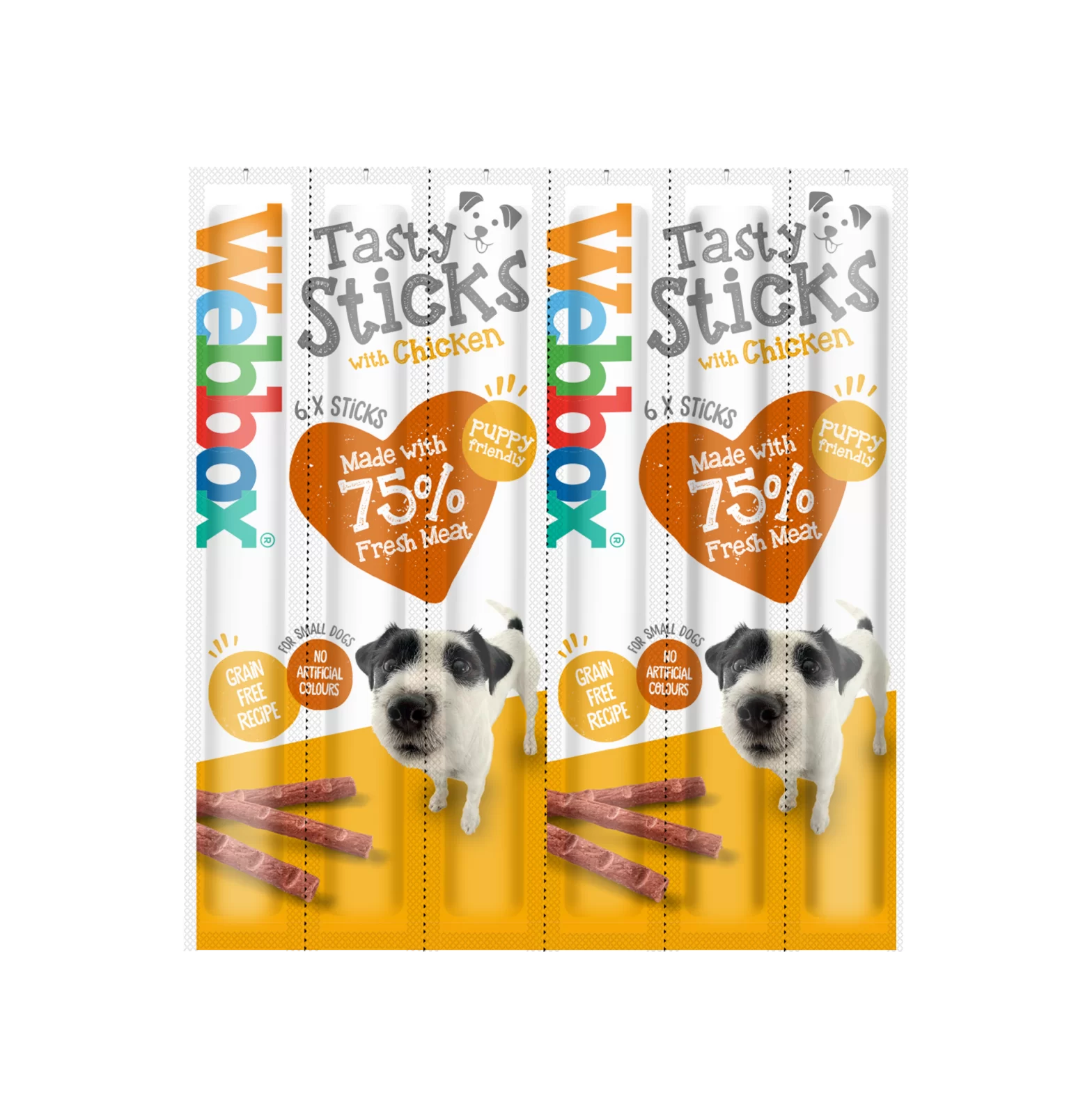 A tasty, complementary pet food for dogs and large breed puppies, Webbox Dogs Delight Tasty Sticks with Chicken are moist, meaty sticks that have been specifically designed with dogs in mind.