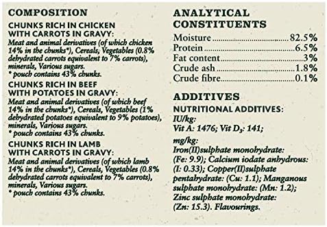 The Purina Winalot Perfect Portions Chunks Dog Food in Gravy contains a high amount of protein, low carbohydrate and a considered quantity of essential nutrients and minerals. The protein helps build strong bones and muscles while vitamins, such as A, D3 and E, maintain their eyes, skin and coat. The iron content promotes agility and vitality and other minerals such as zinc, iron and manganese balance their diet.